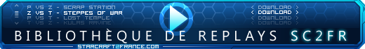 Lancée en septembre 2010, la bibliothèque de replays SC2FR permet à tous nos membres de poster facilement leurs replays et à tout le monde de les télécharger. Les replays postés apparaissent sur le site SC2FR ainsi que le forum dans notre section des replays où les membres peuvent commenter les parties.