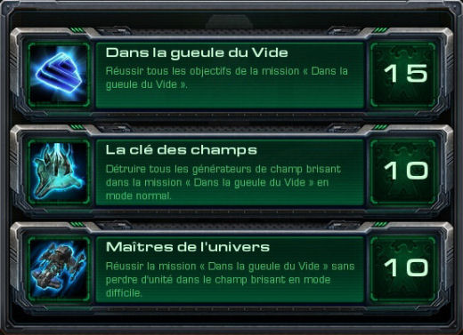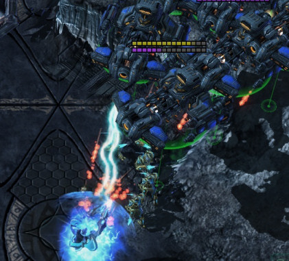 Il a ceux devant vous et ceux complétement au Sud. Vous devriez maintenant avoir de nombreux cuirassés déjà avec les améliorations qui vont avec. Quand vous êtes prêts allez détruire le deuxième générateur au centre et suivez la procédure comme pour le premier. Attaquez ensuite le troisième générateur, celui qui se trouve tout au Sud. Réparez bien vos cuirassés car il vous faudra faire un peu le ménage chez les Protoss. D'ailleurs essayez d'utiliser vos templiers noirs pour vous faciliter la tâche quand c'est possible, ils ne craignent pas le champ brisant !