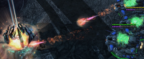 En théorie vous ne devez pas perdre de cuirassé avant la fin de la mission. Quand la zone est dégagée envoyez un VCS prendre les palettes de ressources qui trainent par terre. Mettez un réacteur sur le statioport et lancez la production des cuirassés dès que possible. Positionnez vos cuirassés en bas de la rampe car les Protoss vont vous envoyez des troupes à cet endroit donc le but sera de les tuer le plus rapidement possible avec votre flotte.