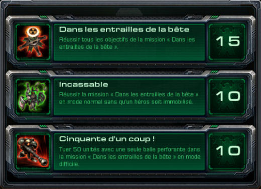 - Incassable : Un HF à faire en mode normal de préférence. Durant la mission suivez les conseils du guide et soyez prudent, ça ne devrait pas poser de problème. Lorsque la reine débarque (champ de larves au Nord), ne vous jetez pas sur elle mais tuez d'abord les petites unités et posez la tourelle de Swann. Quand la zone est un peu plus dégagée attaquez-là avec les héros et balancez la grenade de Tychus et la balle perforante de Raynor. Si un héros est visé reculez-le rapidement pour que la reine change de cible et pour qu'il se fasse soigner. C'est de la pure micro-gestion. Dès que la reine aura perdue une partie de ses points de vie elle va s'enfouir sous terre et apparaitre sur le champ de larves à l'Ouest. Positionnez donc vos héros là bas et commencez même à tuer des larves. Elle va donc surgir et vous devrez répéter la même procédure : poser la tourelle, balancer la grenade et la balle perforante. Elle va de nouveau partir et revenir sur le troisième champ à l'Est, faites comme avant. Ici il y a tout de même une différence car elle va s'énerver et balancer son étourdissement alors le mieux est de s'éloigner d'elle et de placer la tourelle devant vous pour qu'elle serve de cible à la reine. Donc micro-gestion et anticipation. Il y a une sauvegarde automatique juste avant l'arrivée de la reine alors si vous avez du mal il suffit de charger ce passage !