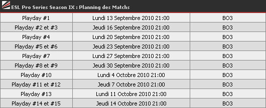 ESL France a organisé plusieurs tournois qualificatifs pour sélectionner 14 joueurs et a invité les deux meilleurs joueurs français du moment (MoMaN et SarenS). Au total 16 participants pour ces EPS.fr avec un prizepool conséquent de 3.500€. Avec un tel système et beaucoup d'argent à gagner, cette ligue/championnat devient donc la référence au niveau français ! Qui sera le meilleur et repartira avec 2.000€ ? Qui pourra créer une surprise et se faire remarquer sur la scène française ? Informations et liens- Date : 13 septembre au 14 octobre 2010 PrizepoolUn joli prizepool pour ces premiers EPS pour StarCraft 2 avec 3.500€ au total dont 2.000€ pour le vainqueur ! En voici la répartition. 1er : 2 000 € Programme