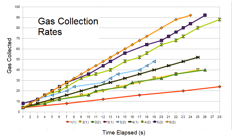 Ci-dessous vous trouverez les courbes du gaz récolté en fonction du temps selon la méthode utilisée. Je rappelle que pour chacune des courbes, le premier nombre indiqué est le nombre de mineurs recoltant et que le second entre parenthèse est le nombre de geysers exploité . Quelques erreurs visibles se sont glissées lors des tests qui m’ont permis de récupérer ces données mais la tendance globale est relativement stable. La conclusion est donc à la fois intuitive et assez raisonnable.