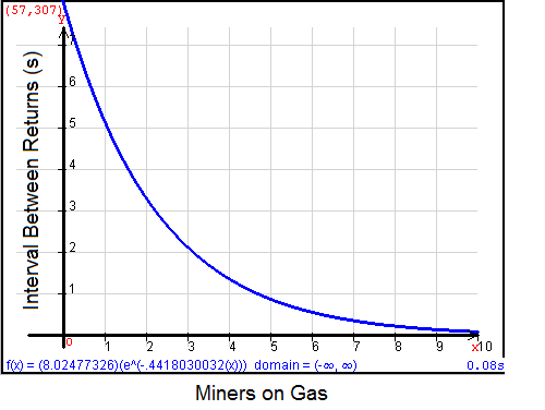 C’est maintenant le bon moment pour un aparté. J’ai choisi la position à 6h de la carte Lost Temple car elle possède une distance de récolte relativement standard, mais tous les geysers n’ont pas été crée de manière égale. Sur certaines cartes comme Metalopolis les geysers possèdent une courte distance de récolte et peuvent donc fonctionner avec une plus grande efficacité que ceux sur le Ravin de Kulas. Dans les cas ou les distances sont plus courtes, la différence de vitesse de récolte entre 3(1) et 3(2) est encore plus élevée car il y a une plus longue attente pour le 3e mineur et donc les 2premiers mineurs sont déjà très efficaces. Mais sur les cartes ou la distance est plus grande, cette différence est réduite par le temps d’attente plus court. Les vitesses précises de récoltes sont néanmoins beaucoup plus utiles pour tirer des conclusions. Les replays de SC2 donnent une idée vague et imprécise de la vitesse de récolte avec l’onglet « income » qui n’est guère d’une grande utilité pour un joueur essayant de savoir quandil doit retirer ses mineurs du gaz ou bien combien de mineurs sont nécessaires afin d’optimiser son BO ou encore quand commencer un second geyser, surtout en étant dans une partie. Les vitesses de récoltes suivantes ont été calculées par régressions linéaires à partir des données obtenues un peu plus haut. Les valeurs b (issues de la régression linéaires) ont été enlevées car elles ne signifient rien et ne sont que les conséquences de ma normalisation. Souvenez-vous bien que la valeur m (la vitesse) est en gaz vespène/secondes, mais comme le gaz vespène n’est pas collecté en continu, mais plutôt par impulsion de 4 unités, ces vitesses sont uniquement utiles si elles sont comparées avec d’autres vitesses avec les mêmes unités de mesures et cela ne vous donneras pas la mesure en secondes du moment où il vous pourrez programmer votre centre orbital par exemple. Une fois ces choses énoncées, voici les résultats : • 1(1) | 0.74 gaz/seconde Plusieurs choses ressortent de ces chiffres. Tout d’abord, comme on pouvait s’y attendre, avoir 2 mineurs sur le même geyser double la vitesse de récolte et avoir 2 mineurs sur 2 gaz séparé double encore la vitesse. Toutefois on peut souligner le fait qu’avoir 3 mineurs sur le même geyser ne triple pas la vitesse de récolte, mais par contre c’est le cas si l’on a 2 mineurs sur 1 geysers et un autre sur un second (cela est du à l’embouteillage mentionné plus haut pour un geyser saturé). Avoir 4 mineurs sur 2 geysers quadruple la vitesse de récolte, mais encore une fois la saturation d’un des geysers ne permet pas de gagner autant et cela est aussi brai lorsque le second est aussi saturé. Peut être, ce qui serait plus utile ici serait de faire une comparaison peu commune, mais paradoxalement beaucoup plus compréhensible pour un joueur moyen avec les seconds/gaz. Essentiellement, nous inversons juste la vitesse de récolte pour avoir quelque chose de bien plus utile. Les chiffres suivants donnent le temps en secondes entre deux arrivées de 4 unités gaz. • 1(1) | 5.40 secondes Maintenant, un modèle convaincant émerge : un modèle qui ressemble à une fonction exponentielle. J’ai pris les chiffres obtenus et j’en ai fait un graphique. Naturellement, les données réelles sont plus précises que la fonction et plusieurs manipulations ont été enlevées de ces données. Nous sommes vraiment en train de travailler dans l’abstraction, mais le graphique ci-dessous nous montre essentiellement que l’intervalle de temps décroit exponentiellement pour chaque mineur ajouté (calculé via une régression exponentielle). f(x)=8.02477326e^(-.4418030032x)