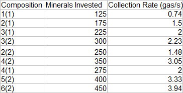 Le graphique présente certaines contradictions. Bien sur, l’utilité réelle du graph est perdue après 6 mineurs car les geysers sont saturés à partir de 3. L’ajustement n’est pas parfait, plus particulièrement parce que le 3(2) est un peu anormal en ce qui concerne ce modèle et il est vraiment très difficile de le compenser les erreurs, mais le graphique reflète bien l’effet que l’ajout de mineurs supplémentaires a sur la vitesse de récolte du gaz. La signification de ce graph pourrait être d’une importance capitale … ou pas tellement. Le gaz semble souvent être une ressource très sollicitée et sa récolte est beaucoup plus limitée que celle des minéraux. Mais le grand nombre d’options disponibles qui permettent d’ajuster la vitesse de récolte et les différentes méthodes d’investissement autorisent un large éventail de possibilités pour les ouvertures mais elles permettent aussi de développer des transitions intéressantes. Fondamentalement, les changements apportés au gaz ont changé le gameplay actuel en permettant aux joueurs de se libérer des deux configurations de récolte de gaz de BW. Tout cela est possible grâce au fait que l’on peut puisse modifier et ajuster la vitesse de récolte du gaz selon nos besoins et plus particulièrement lors des transitions ou des ouvertures de jeu. Ce graphique montre la valeur ajouté de chaque mineur rapporté au suivant ou au précédent, et peut peut-être être utilisé avec prudence pour calculer plus précisément les timings et les ajustements de nos besoins en gaz. Avec toutes ces informations, nous pouvons aussi calculer quelle méthode sera la plus rentable pour chaque minéraux investis si l’on veut prendre du gaz très tôt dans la partie. Nous allons alors comparer ces données avec la vitesse de récolte du gaz car c’est la façon la plus facile de voir les choses comme elles sont (à mon avis). Ci-dessous vous trouverez un tableau qui vous permettra d’y voir un peu plus clair.