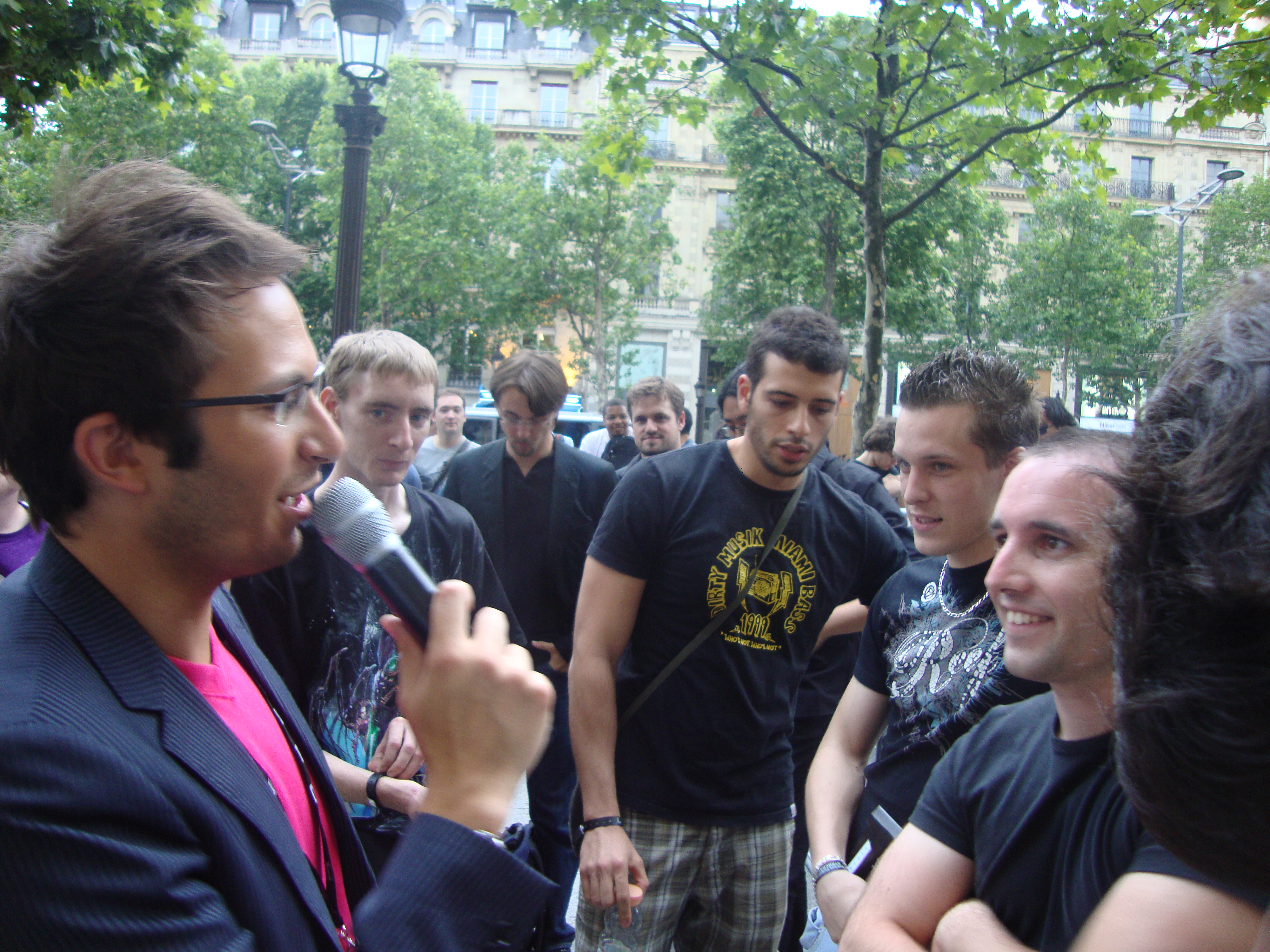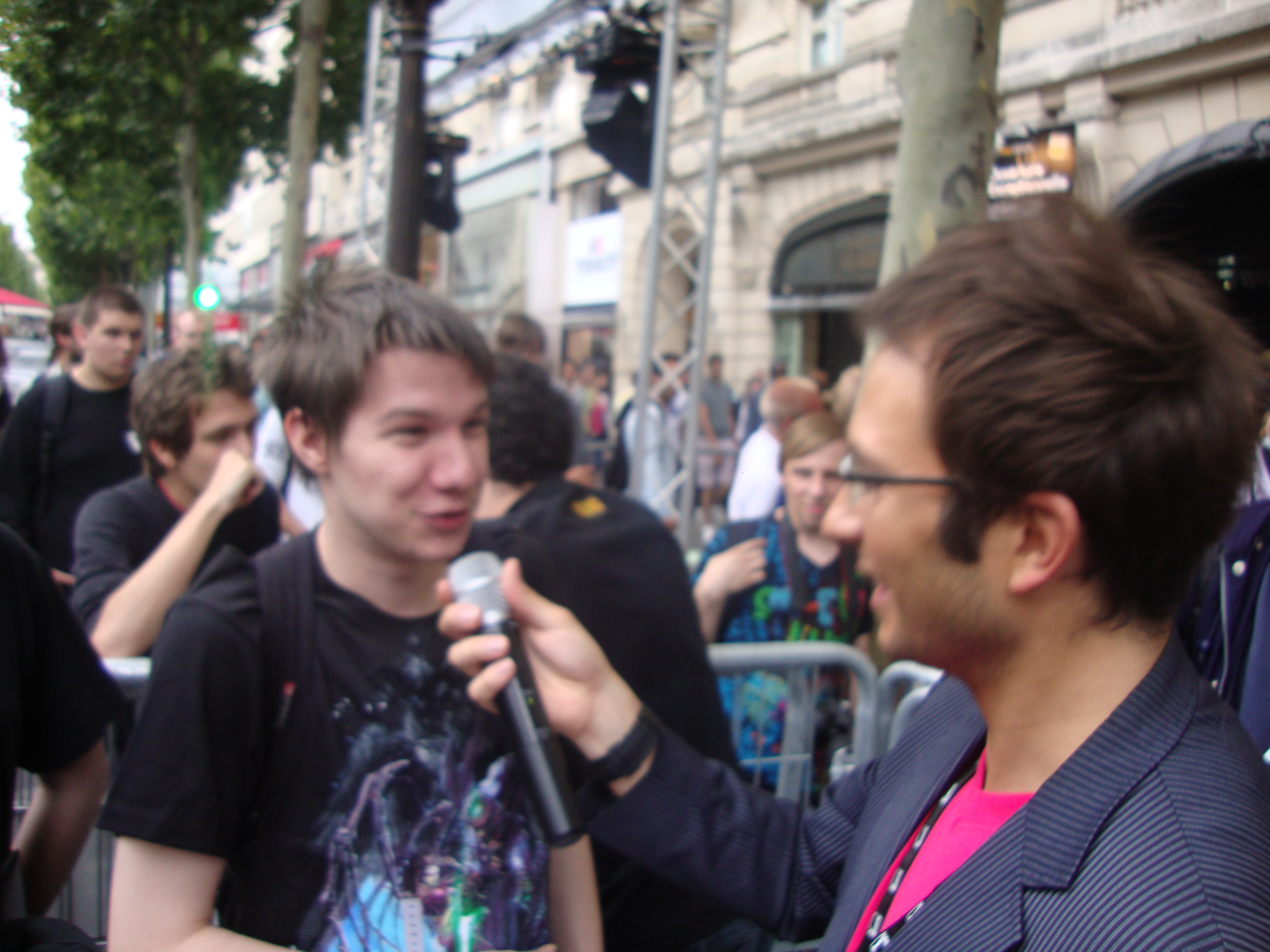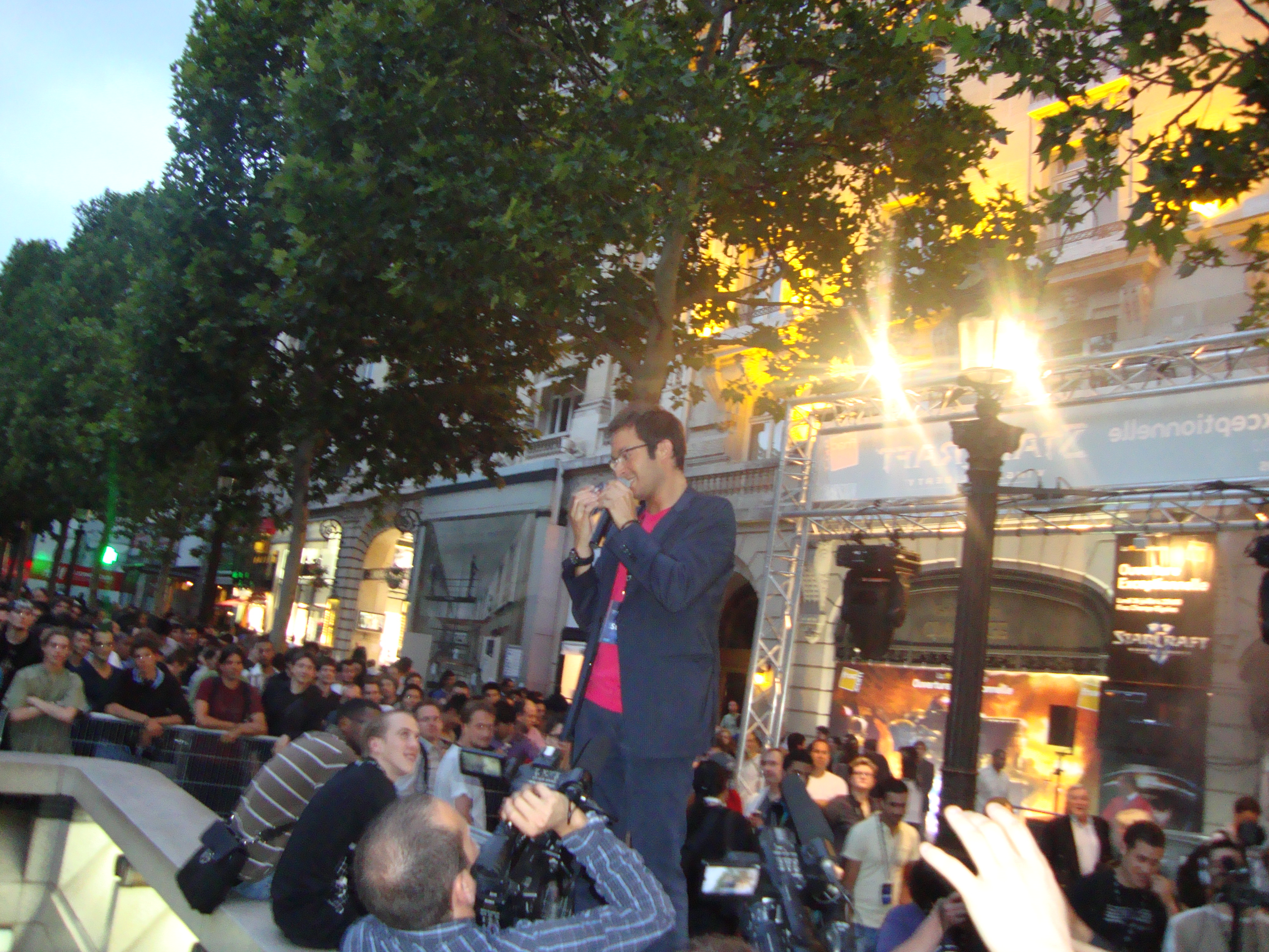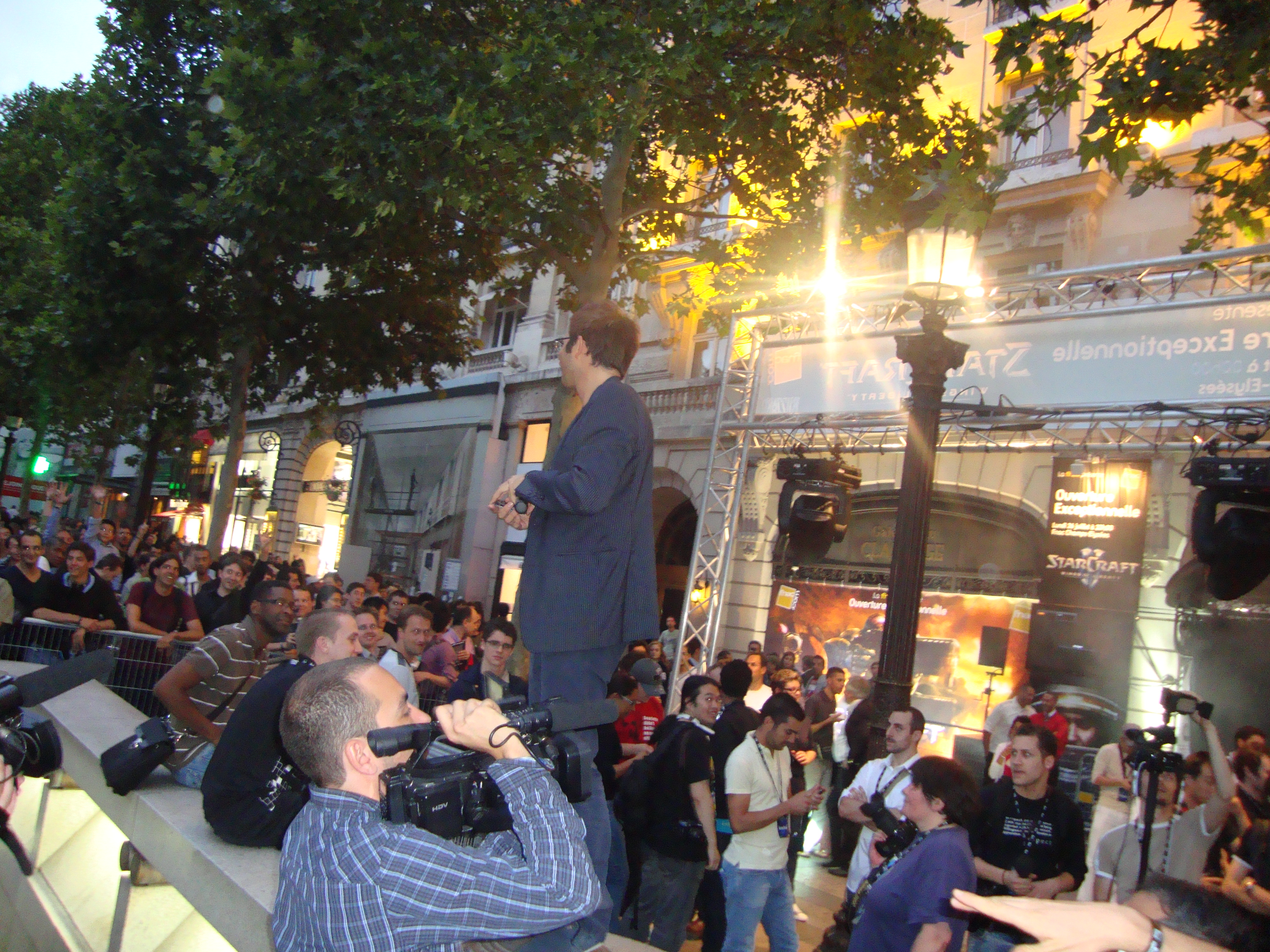 19h30, la distribution de carte va bon train, et j’ai déjà gagné un magnifique… Magnet « I <3 SC2 » … Un peu déçu, on continue de chauffer l’ambiance devant les caméras de plusieurs WebTV, dont GameBlog (forcément) mais également celle du Staff officiel Blizzard. L’ambiance est tellement bonne que je saisis le micro de Julien, et profite de l’occasion pour faire la promotion du site Starcraft2France, avec l’attention d’un millier de personnes. D’ailleurs, la file commence vraiment à être pleine, au moins du coté « VIP ».