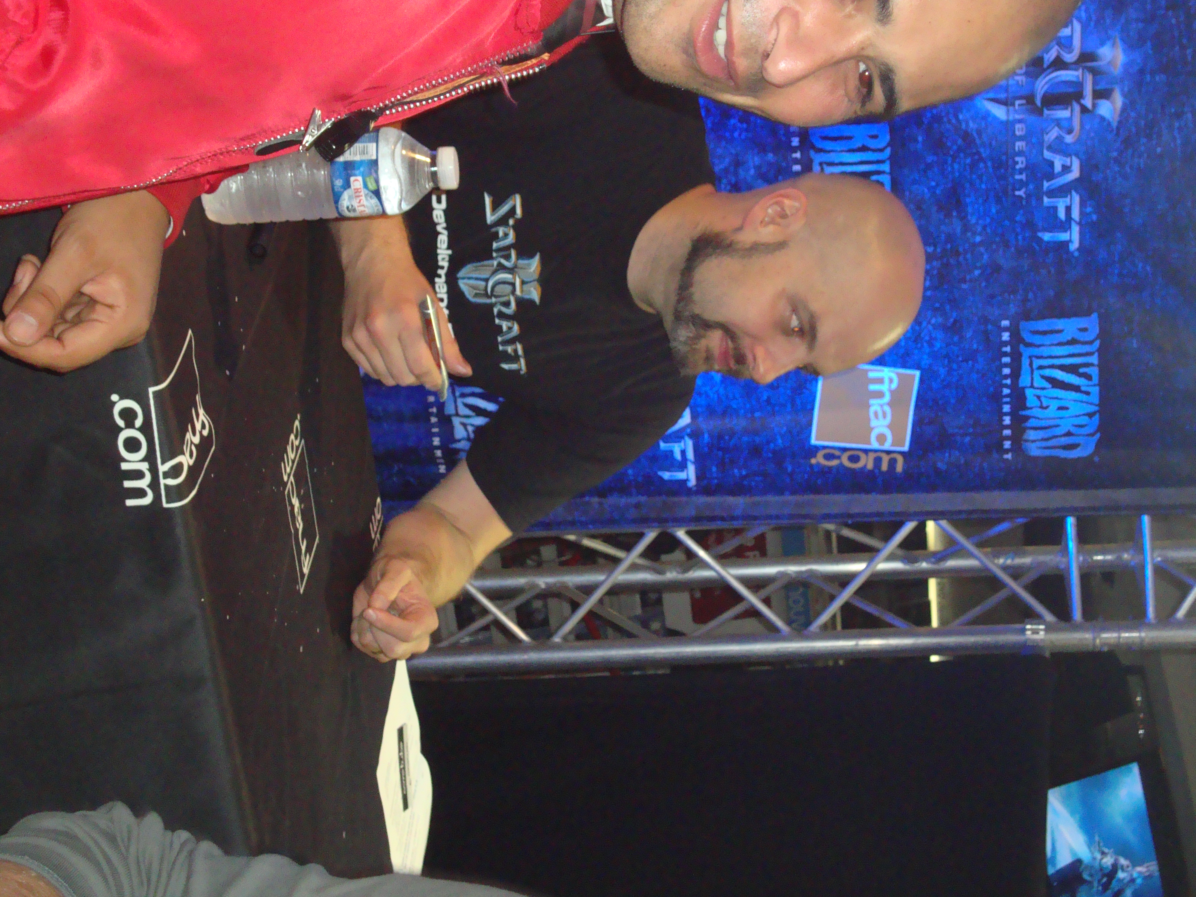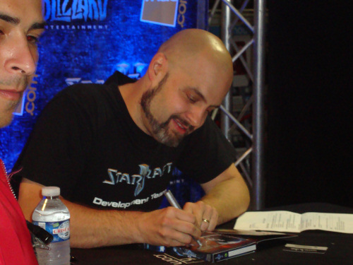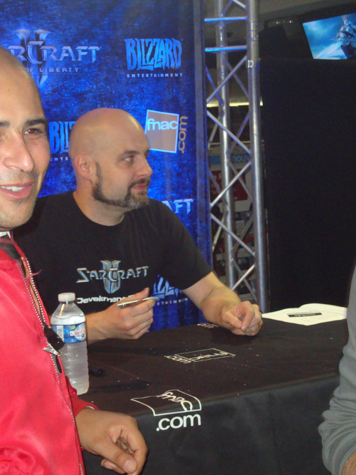 Pas de temps à perdre, je retire mon boitier collector, l’ouvre dans la foulée, et m’engage dans la file d’attente pour les dédicaces. Par chance, je me retrouve devant Browder très rapidement. Comme il n’y a pas grand monde, j’en profite pour lui lâcher deux-trois questions. Je lui demande tout d’abord ce qu’il pense de l’accueil des français, ce à quoi il me répond avec un large sourire « You guys are really incredible. I’m very impressed by the french community around Starcraft II » (Vous êtes vraiment incroyable les gars, je suis très impressionné par la communauté française de StarCraft II). Aussitôt, j’enchaine avec “Impressed ?” (Impressionné ?), et toujours avec le meme sourire “Yeah, nobody in the US would wait more than 12 hours like you to buy our game, that’s fantastic !” (Ouai, personne aux USA attendrait 12 heures comme vous pour acheter le jeu, c'est fantastique). Malheureusement, il me fait comprendre qu’il n’a pas le temps pour plus de questions, car la Fnac lui impose un timing très serré.
