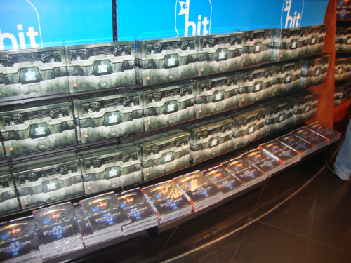 Un a un, les gens s’engouffrent dans le minuscule trou laissé entre deux barrières (et farouchement surveillé par deux gorilles), leur facture à la main. Après seulement 1 minute d’attente, je pénètre a mon tour dans la Fnac, et là, surprise. A peine ai-je le temps de descendre les escaliers, que je m’aperçois qu’une quinzaine de caméras sont braquées sur nous, comme de véritables stars. Nous sommes les premiers, les heureux élus pour recevoir nos jeux SC2. Partout les webTV demandent les réactions à chaud des joueurs. Les gens courent en tout sens, cherchant le lieu de retrait des goodies, le stand de dédicace, ou encore le lieu de retrait de l’édition collector. Ce qui me frappe, ce sont les centaines, voir les milliers de boites collector empilées partout dans le magasin.