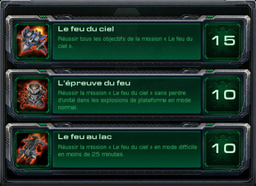 - Le feu au lac : Avec la technique du guide ce HF ne sera pas un soucis. Soyez rapide et visez les tours le plus rapidement possible, ne vous amusez pas à nettoyer toute une zone. Détruisez les sporuleurs que vous allez croiser puis les unités menaçantes (hydralisks, mutalisks, etc) et progressez petit à petit vers une tour puis détruisez là. Pour gagner du temps vous pouvez laisser le Léviathan en vie, cela vous fera gagner plusieurs secondes (trajet et destruction). Et à la fin pour la dernière tour si vous avez beaucoup de banshees vous pouvez même foncez sur la tour pour la détruire, tant pis si vous perdez plein d'unités !