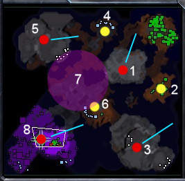 Points rouge : les tours à détruire dans les grandes bases zerg