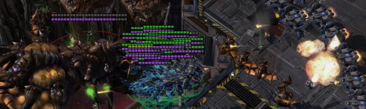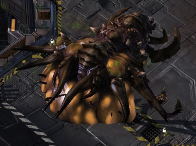 Quand les banshees ne détruisent pas des sporuleurs ils doivent bien sûr tuer les unités terrestres qui peuvent vous poser problème (hydralisks). Nettoyez vous donc un petit couloir aérien vers la tour et détruisez-la quand la voie est libre. Ensuite dégagez de là rapidement pour le HF et pour ne pas perdre d'unités. Bon vous avez le temps vu le temps avant l'explosion mais ça ne sert à rien de trainer...