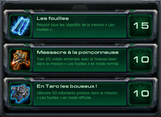 - Massacre à la poinçonneuse : Vu que vous devez vous servir de la foreuse pour détruire les archons, immortels et colosses vous devriez sans problème réussir ce haut-fait. Si vous n'y arrivez pas c'est que vous n'utilisez pas assez la foreuse quand les groupes ennemis se forment aux points de rassemblement. Surveillez la mini-carte et éliminez ces puissantes unités.