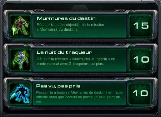 - Pas vu, pas pris : Pas facile, vous devrez surement recommencer la mission une deuxième fois pour connaitre à l'avance les différentes difficultés. Essayez de faire plusieurs sauvegardes en cours de route après chaque étape franchie. Si Zeratul perd un point de vie, chargez simplement la dernière partie où tout était encore bon et refaites l'épreuve. une fois que vous connaissez les pièges c'est assez facile il faut juste être patient et bien utiliser les capacités. Pour la fuite finale placez-le au milieu des traqueurs et n'hésitez pas à le micro-gérer si vous le voyez prendre un coup.