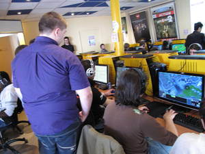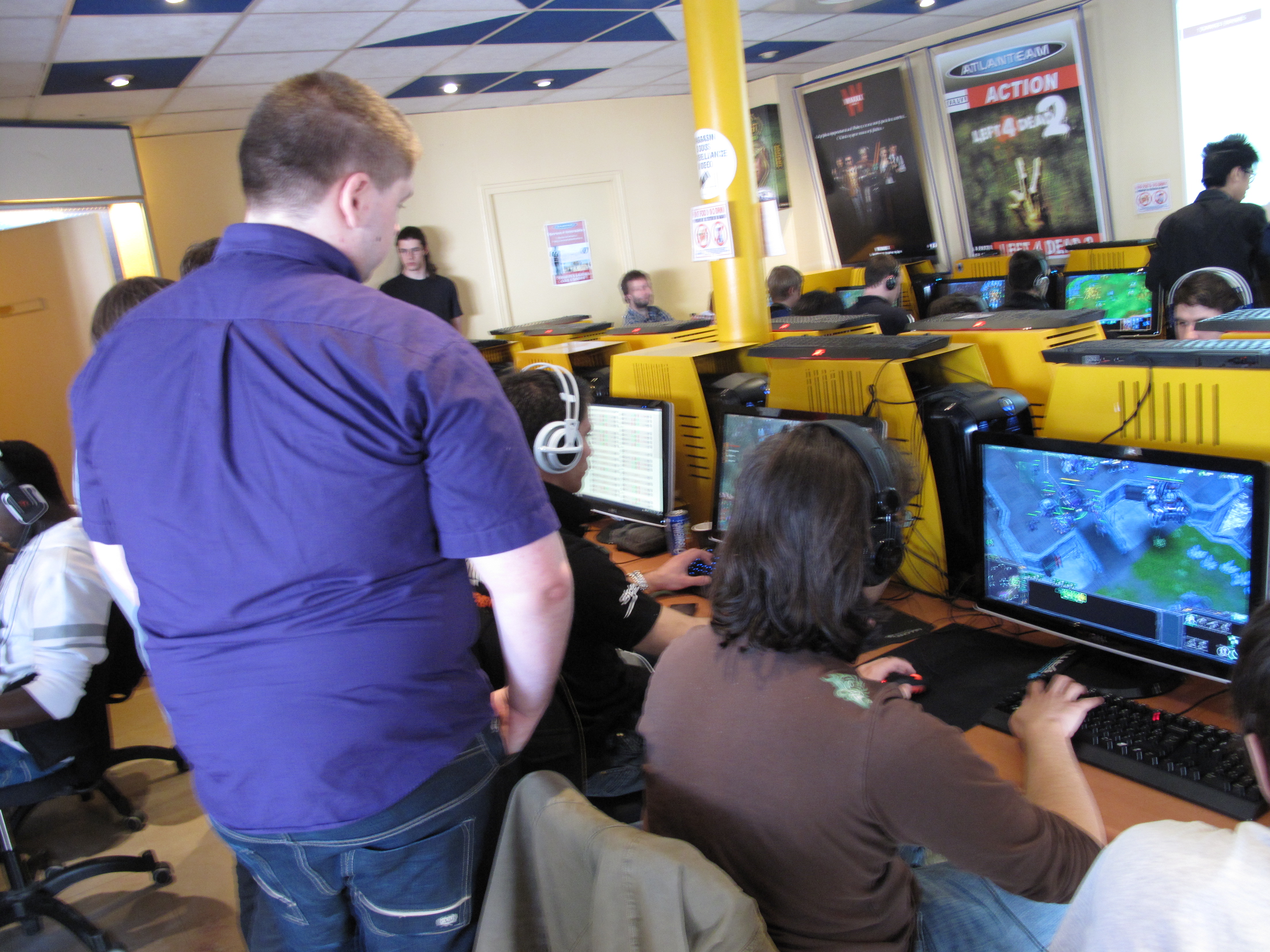 12:00 : J'arrive devant Cybernation et vois quelques personnes en train de discuter stratégie, "rush bunk vs zerg ça paye !". Immédiatement je comprends que je suis à la bonne adresse ;)