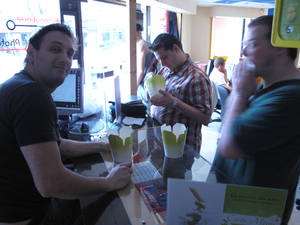 Immédiatement je me présente auprès du gérant, il m'indique qu'on a une place et qu'on peut utiliser l'ordinateur, je vois que Poumka est assis, chemise ouverte, chaine en or qui brille (et quelques poils virils qui dépassent ;) ).