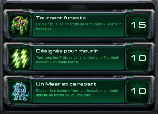 - Un Maar et ça repart : Très simple à faire aussi sauf si vous la faite en même temps que le HF "Désignés pour mourir". En effet les deux sont assez incompatibles puisque dans le premier vous devez prendre votre temps à parcourir la carte et tout raser alors que dans celui-ci vous devez vous dépêcher. Le mieux à faire est de terminer la mission tranquillement puis de la refaire et d'ignorer les camps Protoss à l'Est et à l'Ouest. Faites une grosse armée, protégez votre base et ensuite détruisez la base au centre et terminez la mission. Si vous le tentez en même temps que l'autre HF il faudra attaquer plus tôt et ne pas attendre d'avoir une grande armée. Il y a aussi un autre moyen avec les templiers noirs. Construisez-en 8-9 et envoyez les directement sur les conservateurs. Vous en perdrez sur le trajet mais une fois arrivé à destination il n'y a plus de détecteur ! Vous pouvez aussi faire diversion avec quelques unités pour attirer les tirs ennemis et foncer au travers avec les templiers pour en perdre moins.