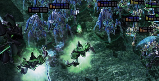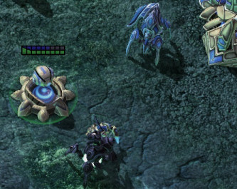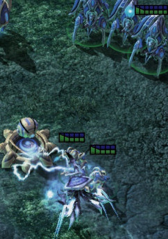 - Le bouclier : Déjà vu dans le guide sur la mission de Zeratul, mais un petit rappel ne peut pas faire de mal. Vos unités et bâtiments disposent donc d'un bouclier qui les protège en plus de leur point de vie. Quand une unité est touché, elle perd son bouclier d'abord et quand le bouclier est à zéro (barre bleue vide), elle perd ses points de vie. Le bouclier se recharge petit à petit alors le mieux est de toujours attendre entre deux combats si c'est possible pour permettre au bouclier de se recharger. Ce bouclier est capital pour les Protoss et pour leur gameplay.