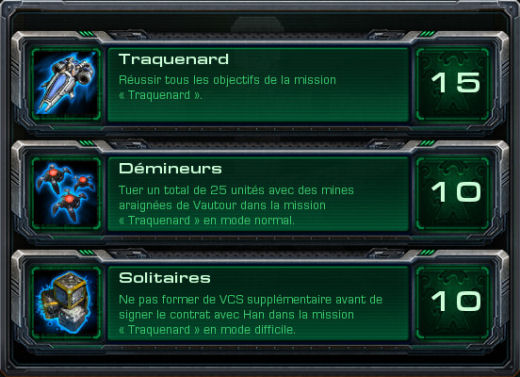 - Solitaires : Un autre HF très facile. Ne faites donc aucun VCS en début de mission, utilisez les quelques unités que vous avez et construisez des vautours dès qu'ils seront débloqués. Dès que vous en aurez 6-7 allez explorer au Nord, tuez les quelques ennemis et le centre de commandement ennemi, et surtout prenez les ressources sur le chemin il y en a plein ! Faites simplement 15-20 vautours en tout ils seront très suffisant pour aller détruire les bases d'Orlan et vous récolterez les 6000 de minerai avant lui. Vous pouvez même en faire moins si vous utilisez beaucoup de mines. Mettez d'ailleurs des mines sur vos deux entrées pour protéger la base. Un fois le contrat signé vous aurez le HF et pourrez faire des VCS pour former une grosse économie.