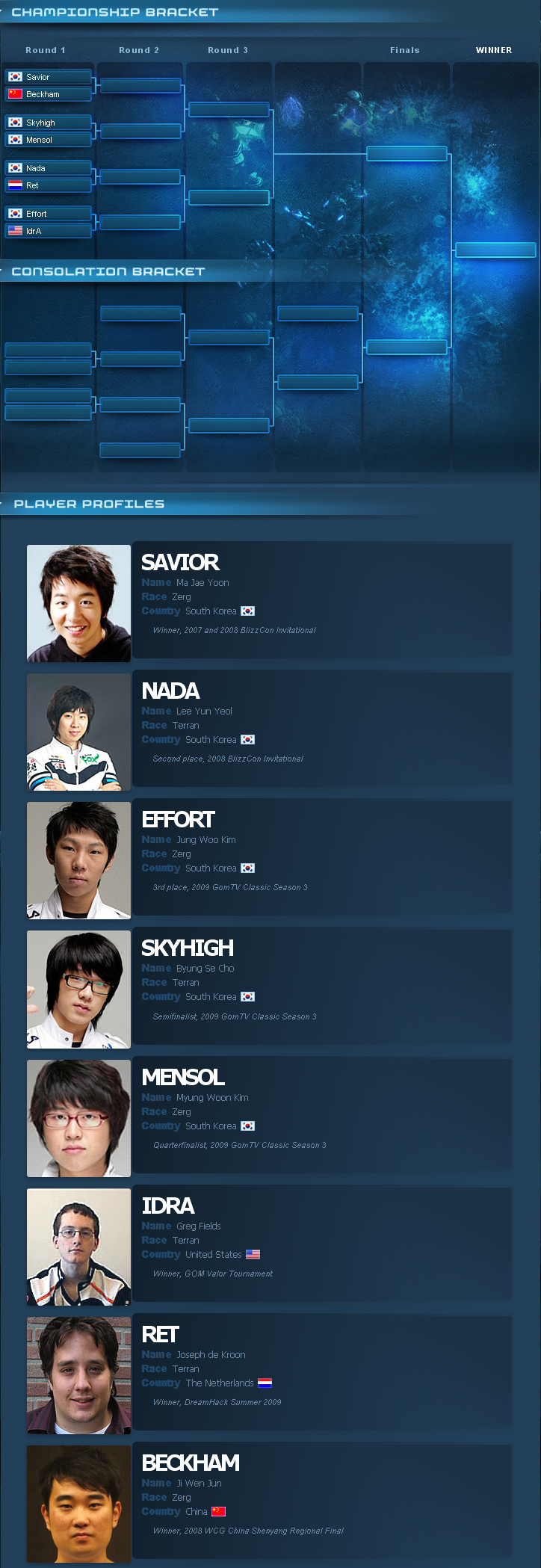 Durant la Blizzcon se tiendra un tournoi sur Starcraft 1 avec des joueurs professionels. Parmis les joueurs on notera la présence des légendes Nada et Savior. Je vous propose ci dessous de voir l'arbre du tournoi ainsi que le profile de ces joueurs.