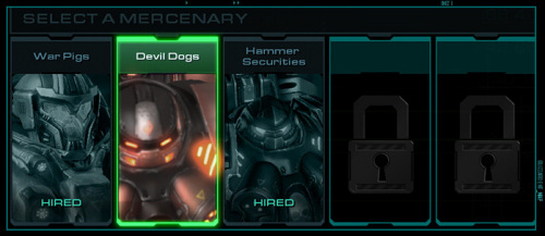 Le barAvec assez de crédits, vous pourrez renforcer vos troupes en passant des contrats avec des mercenaires. Vous pouvez accéder à l’écran des mercenaires en parlant à Graven Hill dans le bar entre les missions. Une fois un mercenaire sous contrat, ces unités aguerries peuvent être utilisées pendant les missions grâce à la planque des mercenaires en dépensant des ressources. En fonction des différents contrats que vous aurez passés, vous pourrez faire appel à vos mercenaires comme vous le souhaiterez durant la bataille. L’utilisation d’un mercenaire impose un temps de recharge avant de pouvoir en appeler un autre.