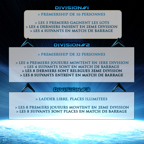 Ce tournoi est donc ouvert à tous. Pour la première saison, plusieurs tournois qualificatifs vont avoir lieu remettant plusieurs séries de points aux participants. A la fin, les joueurs iront dans les différentes divisions selon leur total de points Le premier tournoi qualificatif se déroulera Jeudi Soir. >> Source