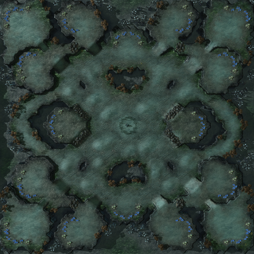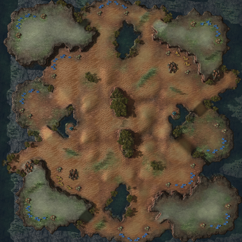 Notre but avec cette carte était d’apporter une solution à ce problème. Que vous commenciez horizontalement, verticalement ou en diagonale, la partie devrait être complètement symétrique pour les deux concurrents. De plus, quel que soit l’endroit où vous débutez, nous avons pris soin de minimiser les éléments pouvant favoriser une race en particulier, afin d’éviter les situations où certaines races éprouvent des difficultés à s’étendre au-delà de deux bases, où les distances de vol entre les bases de départ sont trop courtes, où le chemin central est le seul itinéraire viable pour mener une attaque, ou encore où il y a trop de goulots d’étranglement.