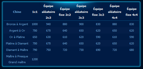 Blizzard vous propose sur Battle.net un article expliquant les secrets du classement. En effet, on se demande tous comment grimper de ligue. Nous vous proposons donc de découvrir cette article. À chaque nouvelle saison de classement, nous recevons de nombreuses questions sur les forums de la communauté demandant : « Que faut-il faire pour être promu dans la ligue supérieure ? ». Vous devriez trouver la réponse à cette question en lisant ce qui suit. Un moyen quasi garanti de changer de ligue à la prochaine saison est de gagner le nombre de points de classement dans votre division correspondant aux valeurs indiquées dans les tableaux ci-dessous avant le 13 décembre, en anticipation du lancement de la saison le 20 décembre. (*Date sujette à modification.) Q : Est-ce le seul moyen d'obtenir une promotion ? R : Non, il s'agit uniquement d'une méthode relativement fiable. Certains joueurs peuvent être promus avant d'atteindre ce nombre, et dans de rares cas, il arrive que certains restent dans leur ligue actuelle après avoir atteint cette valeur. Dans ces cas peu fréquents, les joueurs peuvent s'attendre à une promotion en cours de saison s'ils parviennent à maintenir leur niveau lors de la saison suivante. Q : Comment obtenir autant de points de classement ? R : Le seul moyen d'obtenir d'autant de points est de remporter plus de matchs que vous n'en perdez, et ce pendant une période de temps importante. Par exemple, si vous regardez votre historique des parties et que vous en avez remporté au moins 12 sur 20, vous êtes en bonne voie, continuez comme ça ! *Remarque : ceci part du principe que la saison 4 se terminera la semaine du 19 décembre. Cette date est sujette à modifications. Points de classement indicatifs à atteindre pour une promotion lors de la prochaine saison, par région :