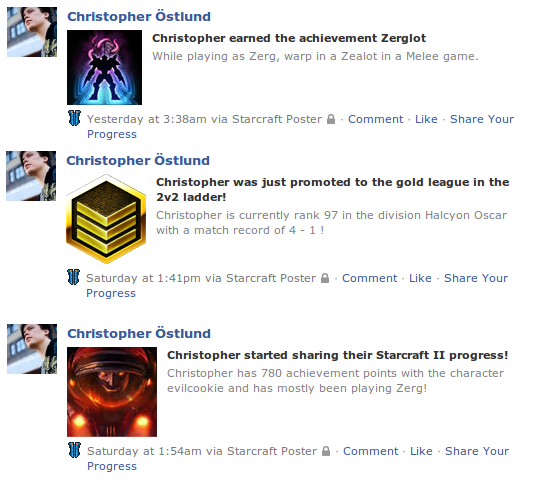 Vous êtes fan de Facebook, de StarCraft 2 et des hauts-faits sur Battle.net ? Vous allez pouvoir pleurer de joie puisque visiblement il existe maintenant une nouvelle application Facebook nommée StarCraft Poster qui permet d'afficher directement les hauts-faits de votre compte StarCraft 2 sur votre page Facebook ! L'application poste aussi un message si vous changez de ligue. Un exemple en image :
