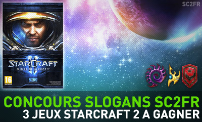 Voici donc les slogans et les gagnants. Ces trois gagnants vont être contactés par message privé sur le forum alors je les invite fortement et rapidement à vérifier leur boite de reception et à me répondre avec les informations dont j'ai besoin. L'envoi du jeu se fera le plus rapidement possible. Slogan Protoss  Slogan : Jamais sans mon pylone Gagnant : Bobosc2 Slogan Terran  Slogan : Je suis victime, du syndrome de Tourelle Gagnant : AirborneCody Slogan Zerg  Slogan : Quand on aime on ne compte pas Gagnant : Mraptor Bravo aux gagnants et merci aux autres pour votre participation. Il y aura prochainement d'autres concours sur SC2FR dont sûrement un pour fêter la sortie de notre bibliothèque de replays. Une bibliothèque qui ne devrait plus trop tarder normalement.