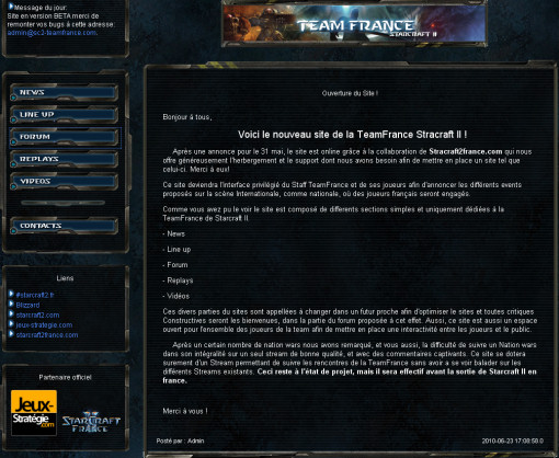 Le site est encore en version beta et se remplira dans les semaines à venir. D'ailleurs si vous avez des remarques vous pouvez contacter l'administrateur par mail ou poster sur le forum du site. Avec une telle structure il sera donc plus simple de connaitre toutes les informations sur l'équipe et de suivre son parcours. Il ne reste plus qu'a attendre le retour de la beta et la sortie du jeu pour que l'équipe puisse se frotter aux autres pays ! > Site Team France : http://www.sc2-teamfrance.com > Forum Team France : http://forum.sc2-teamfrance.com