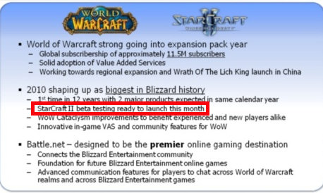 Durant la conférence Activision Blizzard je pensais avoir mal entendu, mais la nouvelle est confirmée par de nombreux messages sur les forums. Blizzard a donc annoncé que la beta allait commencer ce mois mais également que la sortie du jeu était prévue pour mi-2010. On peut donc en déduire que la beta va durer environ 3-4 mois si elle débute fin février. Enfin pour la date de sortie ils n'ont pas été plus précis mais cette annonce n'est pas innocente. On voit mal maintenant la beta durer 6 mois même si le "mi-2010" reste vague... C'est donc une excellente nouvelle car ça veut dire que StarCraft 2 est vraiment lancé et que maintenant les choses vont s'accélerer. Après presque 3 ans de souffrance les fans peuvent donc enfin être rassurer, StarCraft 2 arrive ! Nous avons une page spéciale pour la beta sur le site qui sera mise à jour dès qu'on aura plus d'informations.