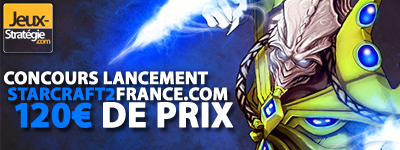Petit rappel pour tout ceux qui ne sont pas au courant (si si, j'en vois là-bas dans le fond !), le concours de lancement de Starcraft2France.com, site du réseau Jeux-Stratégie, a débuté il y a un peu plus d'une semaine maintenant. Le concours, un quizz très simple et rapide ouvert à tous, se termine le 2 décembre prochain, donc il vous reste encore du temps mais n'attendez pas la dernière minute ! Ce serait tout de même dommage de passer à coté d'un concours aussi simple doté de 120€ non ? Pour participer à ce concours rien de plus simple ! Allez simplement sur la page du concours et lisez le règlement puis répondez aux quelques questions du quizz. Bonne chance à tous !